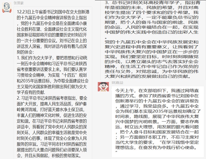 本次活动采取线上线下共同参与的形式,自主选择观看方式,会议后共同在线上积极进行讨论。张晋豪同志表示,我们作为交大学子,要把思想和行动统一到五中全会精神和习近平总书记来陕西省考察重要讲话要求上来,我们要认真学习贯彻全会精神,为实现“十四五”规划和2035年远景目标,为夺取全面建设社会主义现代化国家新胜利做出我们做为交大学子应有的贡献。魏方岩同志表示,在教育方面,习总书记对广大青年提出了四点要求和四个希望,从中我们可以深切的感受到习总书记对中国教育的重视,对我们新一代青年未来发展的重视,作为正在读研究生的我们,不仅要做好自己的本职工作,要注重理论结合实践,更要把爱国放在首要位置。朱慧进同志说,习近平总书记对高校的四个要求和对学生的四个希望,习近平总书记对于教育是相当重视的,作为学生的我们应该努力学习文化知识,同时应该知行合一,学以致用,勤于实践,把书本上学到的知识应用到实际生活中,我们还应当砥砺奋斗,通过奋斗成为新中国建设的有用人才。我们应当牢记习近平总书记的嘱托和教诲!