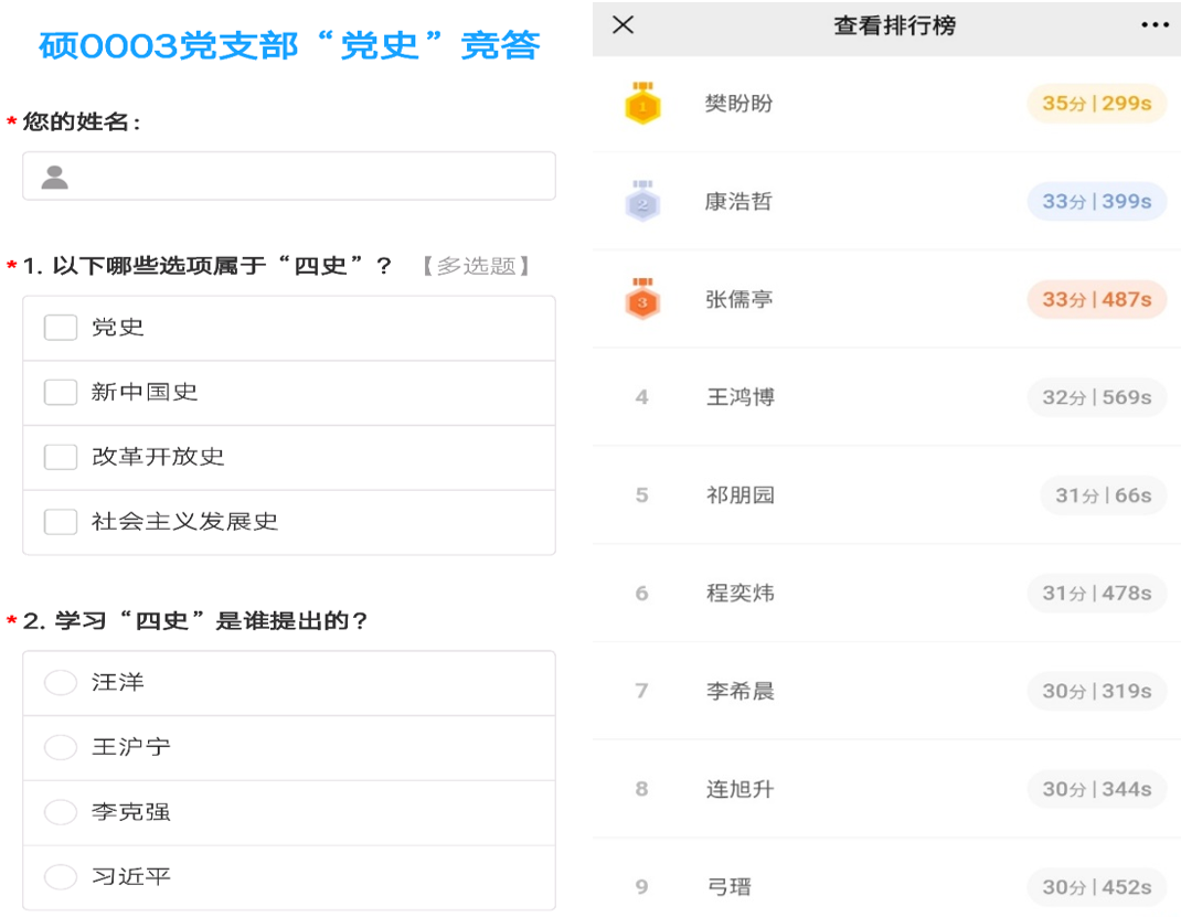 最后,针对大家学习的党史知识进行了有奖竞答环节,同学们通过问卷回答问题,最终都取得了优异的成绩,巩固了学到的党史知识。