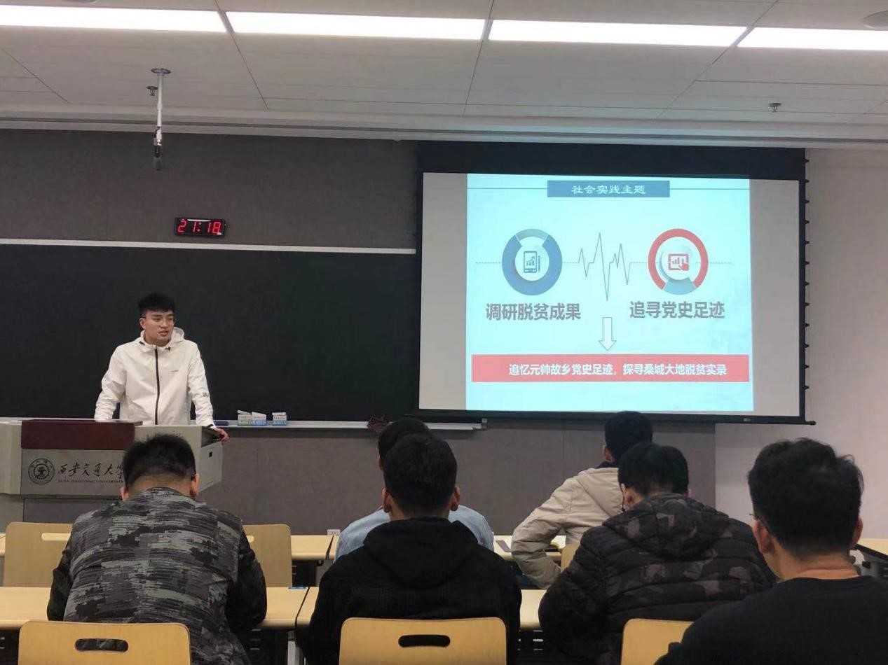 然后是聂天同志进行寒假社会实践活动分享,聂天同志寒假期间以小组为单位开展了“追忆元帅故乡党史足迹,探寻桑城大地脱贫实录”的社会实践活动,活动内容主要为在陈毅元帅故乡调研脱贫成果,追寻党史足迹。活动以参观学习、采访调研、探讨交流、走访调研、问卷调查、数据分析等形式展开,成果颇丰。根据调研的结果,团队给当地政府提出了一些实质性的政策建议,活动也被校内外多方媒体报道,浏览量超过千余次。