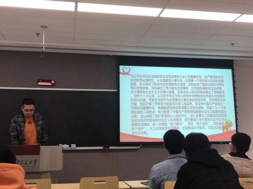 接着,徐铭坤同学带头和在场所有同志们一起学习贯彻习近平总书记在全国脱贫攻坚总结表彰大会上的重要讲话精神,并对其核心进行重点学习:经过全国各族人民共同努力,在迎来中国共产党成立100周年的重要时刻,我国脱贫攻坚战取得了全面胜利;没有哪一个国家能在这么短的时间内实现几亿人脱贫,这个成绩属于中国,也属于世界,为构建人类命运共同体贡献了中国力量;中国共产党具有无比坚强的领导力、组织力、执行力,是团结带领人民攻坚克难、开拓前进最可靠的领导力量。