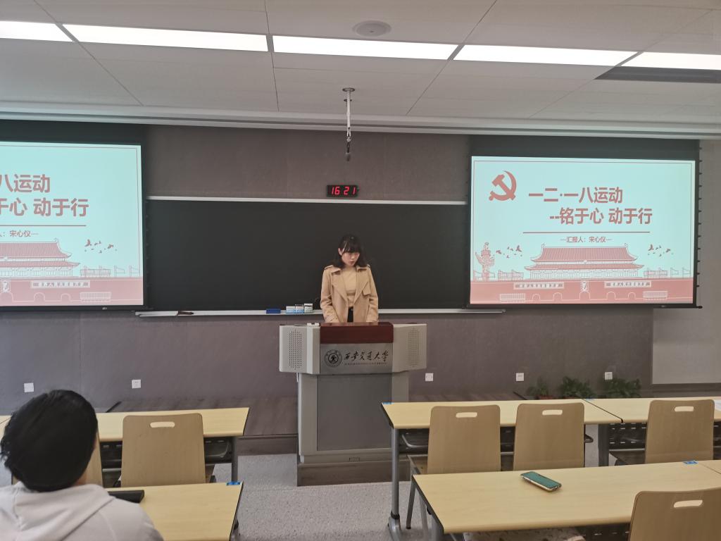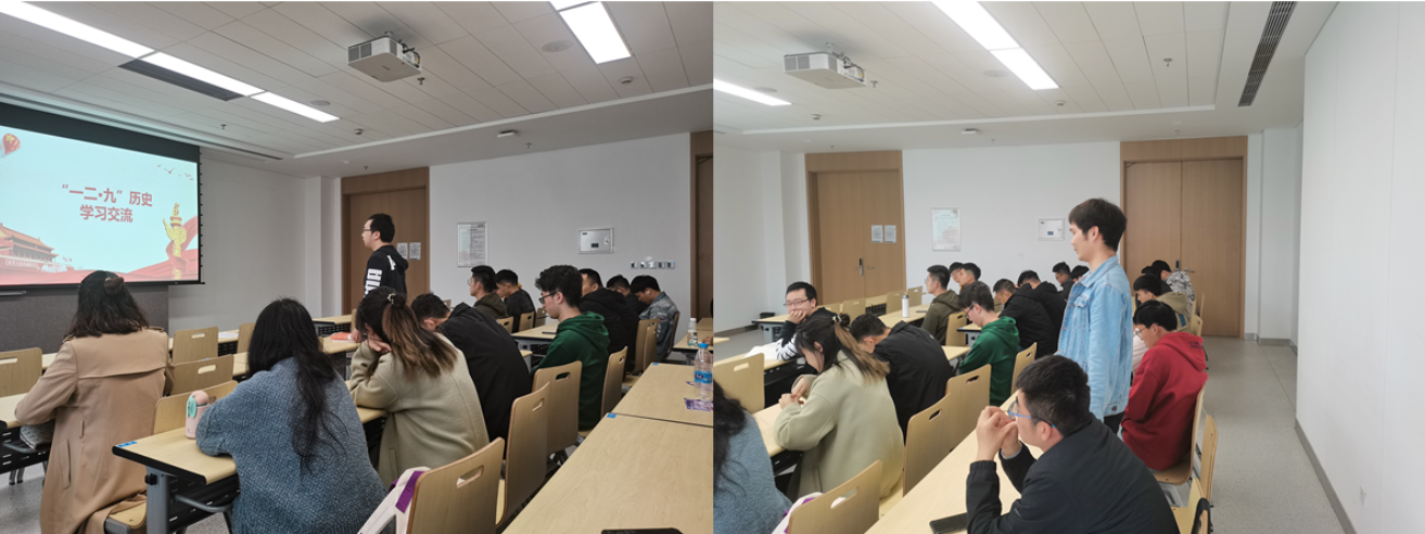 首先是 “一二·九”运动历史的分享,赵飞楠同志为大家分享了“一二·九”运动的相关历史背景,以及整个 “一二·九”运动的过程。通过观看相关视频,同志们被“一二·九”运动的前辈们所表现出的爱国主义精神所感动,加深了对这一爱国主义运动的认识。