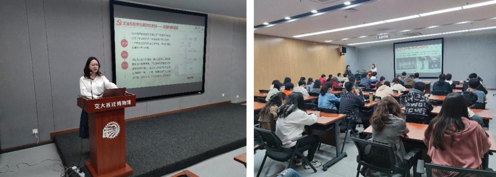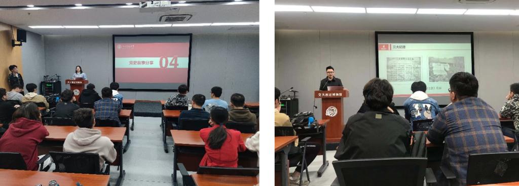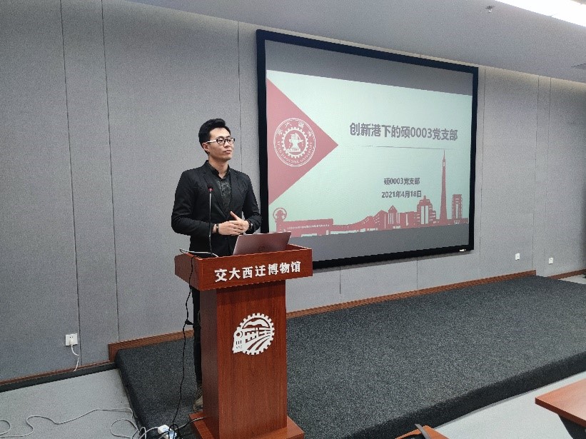紧接着文治书院学生第四党支部阮唯欣同学进行了交大党史故事分享,介绍了交通大学第一个支部成立、交大西迁以及彭康校长等故事。