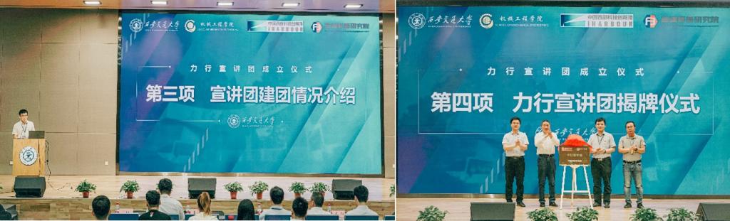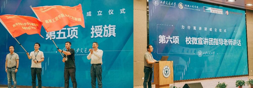 王朝晖、薛周利、苏翔、陈晨共同为力行宣讲团揭牌。陈晨、王朝晖向力行宣讲团负责人杨江坤、世俱杯官方网站团工委书记苏宇授旗。