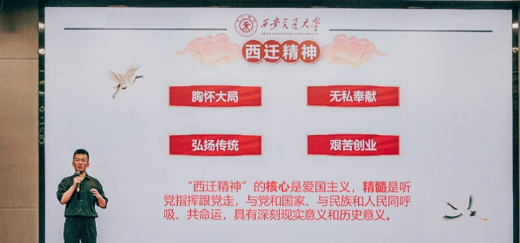 力行宣讲团成员高博楠进行了首场宣讲。他用在军队生活的经历以及生活中的点滴与“胸怀大局,无私奉献,弘扬传统,艰苦创业”西迁精神相结合,并呼吁所有同学们,作为新时代的中国青年,新时代的交大学子,更应该在新的时期,新的机遇下抱有远大理想,练就过硬本领,牢记使命担当,不负韶华,勇攀科研高峰,为我国的科学技术事业贡献新的方案,创造更多可能。