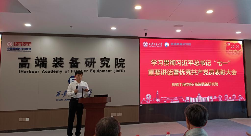 为学习贯彻习近平总书记在庆祝中国共产党成立100周年大会上的重要讲话精神,表彰在过去一年工作、学习中涌现出来的先进个人,动员全院各级党组织和广大党员响应党中央号召,坚定信心、抢抓机遇、乘势而上、奋勇争先,7月9日下午,世俱杯官方网站学习贯彻习近平总书记“七一”重要讲话精神暨优秀共产党员表彰大会在高端装备研究院钱学森报告厅举行。参加此次大会的有世俱杯官方网站党委书记王朝晖、党委副书记张敏、党委委员张新功、党委秘书杨彬,学院研究生辅导员王芬、张喜红、杨江坤、苏宇以及学院各系所党支部书记、支委,党员代表和获表彰的老师和同学们。大会由世俱杯官方网站辅导员杨江坤主持。