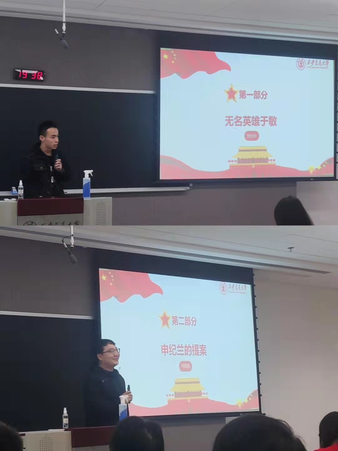 李传祥同学全面介绍了老英雄张富清的一生,从五个方面评价了这位老英雄:当兵的神话、深藏功与名、权力不及亲、永远在路上、心中无小我,最后用一句话概括就是:“73年党龄,60多年深藏功名,他用自己的朴实纯粹、淡泊名利,书写了自己精彩的人生。”连旭升同学从袁隆平院士的早年经历、科研之路、东方魔稻和元勋美梦四个方面,为我们展示了一位稻田的守望者,同时做着“禾下乘凉梦”与“杂交水稻覆盖全球梦”的令世人敬佩的伟人。