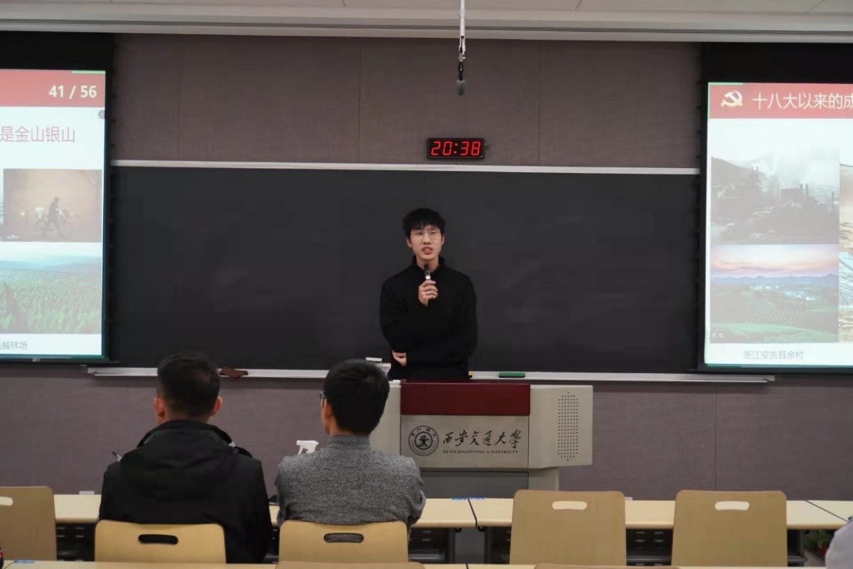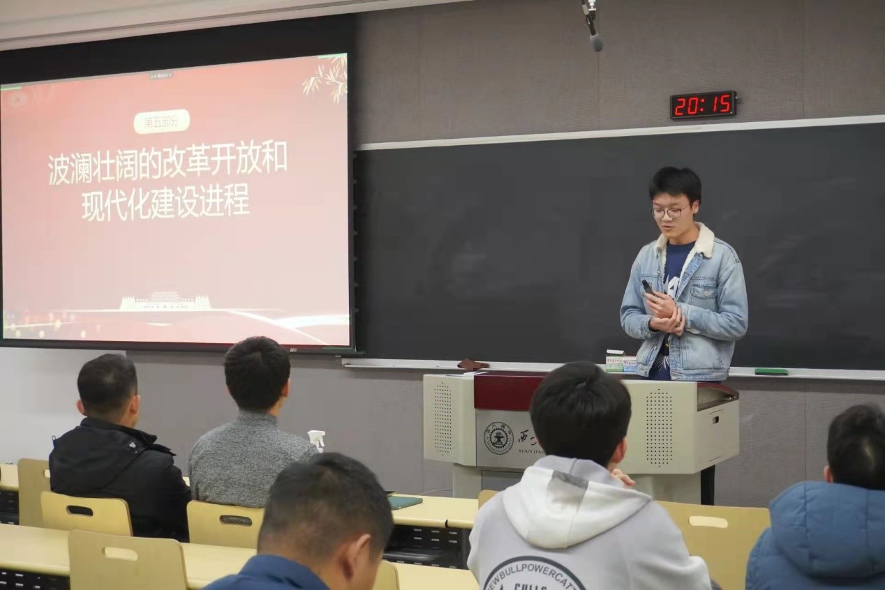 陆涛同学从邓小平同志革命生涯的三起三落切入,为大家讲述了从十一届三中全会开始的改革开放进程,带大家了解了改革开放为国家建设和人民生活带来的巨大变化。
