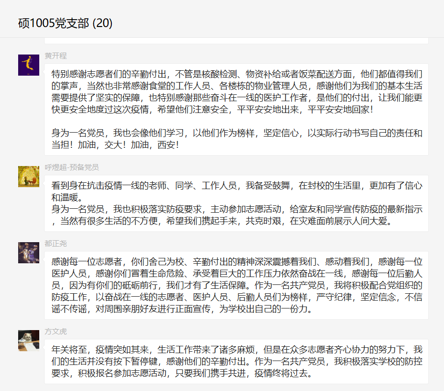 朱天伦同志分享道:“21年末,病毒袭击西安,古城紧闭、三秦不安,广大医护人员等战斗在抗疫一线的英雄们为一千三百万西安市民筑成了一道钢铁长城,保护着广大人民群众的健康。在创新港,也有一批医护人员、物业人员、后勤人员和志愿者不辞辛苦、不惧危险地为交大师生服务,将病毒挡在墙外,守护着一方土地。我作为研究生党员,为了发扬带头作用,贯彻为学生服务的宗旨,在隔离期间主要负责了世俱杯官方网站必需生活物资的需求收集、集中采购与分发工作,还参与了一些其他志愿活动,尽我所能地在特殊时期履行好党员职责,服务好我院学生。我认为,每个党员都是一面旗帜,越是特殊时期越是发挥我们的作用的时候,关键时刻挺身而出才是党员本色。”