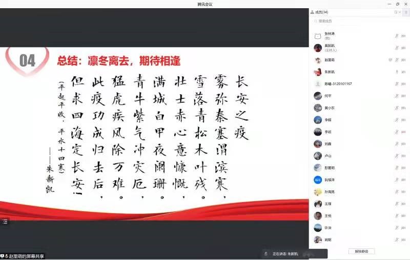 在这场疫情中,无数的抗疫力量涌现出来,共同发力,帮助我们度过难关。赵里萌同学向大家介绍了政府、社会、学校的多方面举措,希望大家能够铭记援助之手,心怀感恩之情。面对变种病毒,政府开展大规模核酸检测,加强重点区域防控,同时调配生活物资,保证民生供应;以市政府、企业和个人为代表的社会力量进行物资捐赠,为西安抗疫汇集力量;校园里,党员干部、辅导员和学生志愿者,各出其力,各展所长,保障师生基本正常生活。没有一个冬天不可逾越,希望我们共同携手,期待春天的到来。朱新凯同学表示,我们要弘扬伟大抗疫精神,增强抗击疫情的精神力量。同时他还赋诗《长安一疫》,表达对各行各业抗疫英雄的感恩之情以及战胜疫情的坚定信心。
