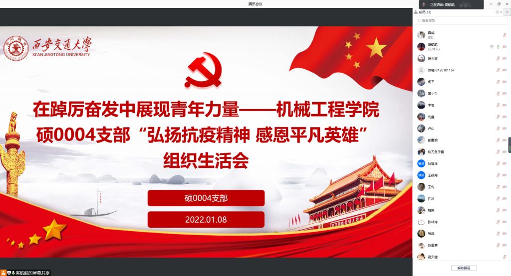 岁末年初,一场突如其来、态势凶猛的新冠肺炎疫情阴影笼罩三秦大地。面对疫情,西安人民站在一起、心手相连、同舟共济、共同坚守、全力应对。为致敬这些奋战一线可爱可敬的无名英雄们,同时发扬我校学子“饮水思源”的优良传统,1月8日,世俱杯官方网站硕0004党团支部召开线上组织生活会,弘扬抗疫精神,感恩平凡英雄,号召全体同学以青春践行使命担当。
