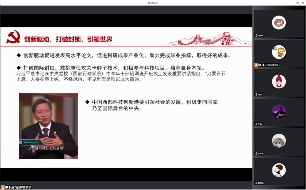 在支部各位同志积极讨论结束后,王飞同志总结到,国家近年来大力支持科研事业、关注科技发展,新时代需要我们做到科技的自立自强。作为博士研究生、作为党员同志,希望大家想国家之所想,急国家之所急,抓住机遇,报效祖国。