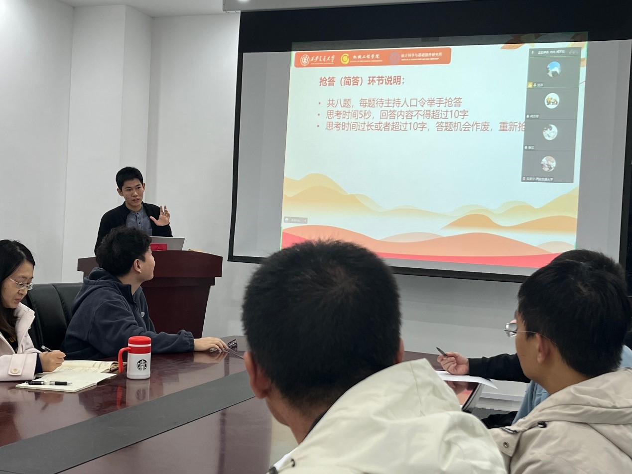 会议由设计所博士生第三党支部书记刘洋同志和宣传委员杨浩同志组织策划,杨浩同志担任主持,王伟同志担任会议记录。问答环节通过填空、选择、抢答和简答等多种形式,围绕党中央八项规定的常识和理解等内容,并密切结合二十大会议相关讲话,开展了对各位同志、同学关于改进工作作风、密切联系群众的八项规定前期学习情况的考察。