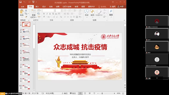 2020年2月29日下午4点,硕9001党支部召开组织生活会。本次会议由支部书记庞丁主持,由朱逸风和张平两位党员同志主讲。由于受疫情影响,本次组织生活会采用线上会议的形式开展。本次组织生活会的主题是“众志成城,抗击疫情”。