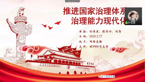接着,孙佳星和刘智同志开展了本月的主题党课,主题内容是推进国家治理体系和治理能力现代化。坚持和完善中国特色社会主义制度、推进国家治理体系和治理能力现代化,是全党的一项重大战略任务。此主题一共分为七个部分,分别为国家治理体系和治理能力的内涵、思想指引、总体目标、国家治理面临的重大问题和挑战、原则与措施、从新冠疫情看国家治理体系、大学生党员奋勇向前。