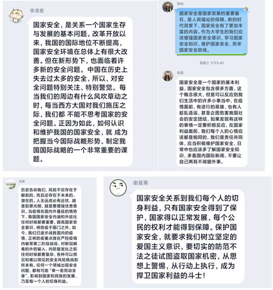 为了让今年的全民国家安全教育日活动主题是“坚持总体国家安全观,统筹传统安全和非传统安全,为决胜全面建成小康社会提供坚强保障”进一步深入人心,硕9003党支部组织党员、预备党员以及积极分子在观看完国家安全教育日高校公开课后,在QQ群中进行了线上讨论和交流。