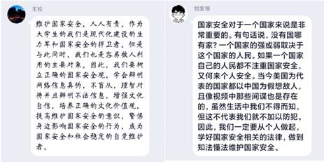 各位同学以自己在观看过程中的所思所想所得发表了自己的感想。王淼同学说:“国家安全是国家发展之本,无法维护国家安全就无从谈起国家发展,国家发展也是多方面的,除了维护领土安全,生物安全,卫生安全同样重要。此次疫情爆发,中国与国外所采取的应对措施,目前的控制态势都可以看出中国是有能力且能做到维护国家安全的。作为大学生的我们,足够的知识储备可以帮助我们辨别大多数信息的真伪,我们有义务去为他人去普及这些正确信息,不传谣,不造谣,同时自身也需要提高国家安全意识,做事以保护国家利益为底线,提高国家安全观,从自身做起维护国家安全。”