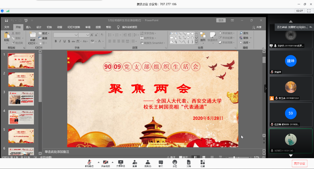 2020年5月28日晚7点,世俱杯官方网站硕9009班党支部成员在腾讯会议平台召开组织生活会,就王树国校长亮相“代表通道”进行集体学习。会议由党支书刘丽媛主持,全体党员和部分积极分子代表参加会议。
