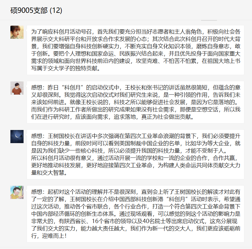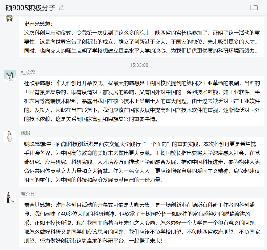 邬宏同志说:“起初对这个活动的理解并不是很深刻,直到会上听了王树国校长的解读才对此有更深入的了解,王树国校长介绍希望通过这次活动,推动各个省市联合,各个行业合作,打造一个符合第四次工业革命背景下中国内部经济循环的创新生态体系。通过现场观看,可以感觉的到这个活动的影响力是非常大的,有陕西省长、16个省市的领导以及40名院士等出席启动仪式,这充分展现了我们交大的实力,能力越大责任越大,我们作为新一代的交大人,我们更应该砥砺前行,迎难而上!”