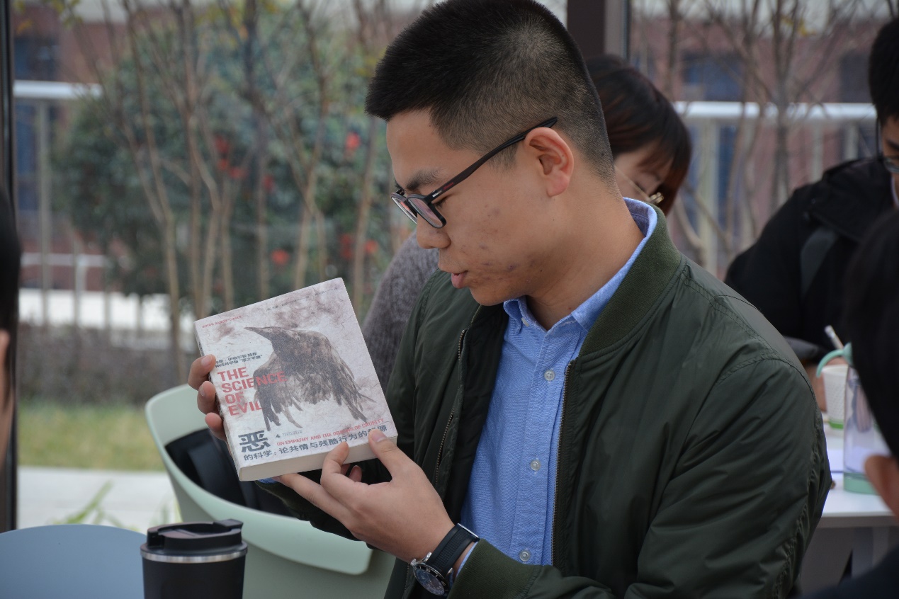 宋林同学首先给大家同大家分享了《恶的科学:论共情与残酷行为的起源》,这是知名临床心理学家,剑桥大学精神病理学教授西蒙·巴伦-科恩的脑科学著作。宋林同学从生理和心理影响出发,给大家讲述了“恶”的来源。穿越善恶评判的语言迷雾,直击人类残酷行为的发生逻辑,从共情能力出发,带领同学们重新认识了人性的“阴暗面”。他介绍说,“恶”可能是先天遗传的,或许它存在于我们的基因,或许是受我们原生家庭的影响,但不论怎样,一个人的“恶”是可以被后天环境所影响而改变的,所以我们更应当保持善良,这是很珍贵的品质。用我们的善良去感染周围的人,来减少社会的“恶”。
