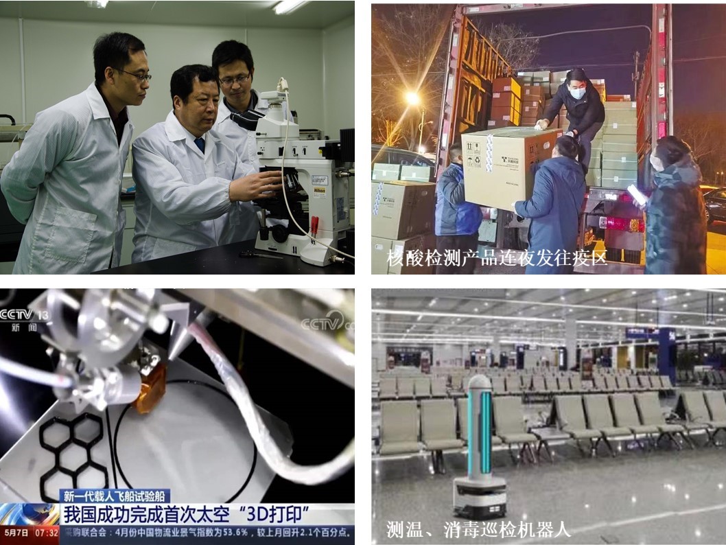 赋能社会服务,贡献科技力量。学院/研究院以引领学科发展、推动行业进步为己任,立足西部,面向全国,服务国家重大需求,助力经济社会发展。研发原创技术,实现我国首次太空3D打印;研发一种基于GelMA的高灵敏度、透明、皮肤适形、可完全溶液加工的柔性可穿戴触觉传感器,实现在人身体上的可穿戴医疗应用;研发测温、消毒巡检机器人,应对新冠疫情,提高消杀效率,降低人群暴露风险;研发新冠肺炎病毒检测设备和核酸检测试剂,目前累计为全国31个省市区提供了1.4万余台检测设备,配套9000余万人份试剂,为湖北及全国疫情防控提供“硬核”保障。此外,在秦巴山区、西部边陲等地区开展精准扶贫,借助学科和技术优势助力当地精准脱贫。