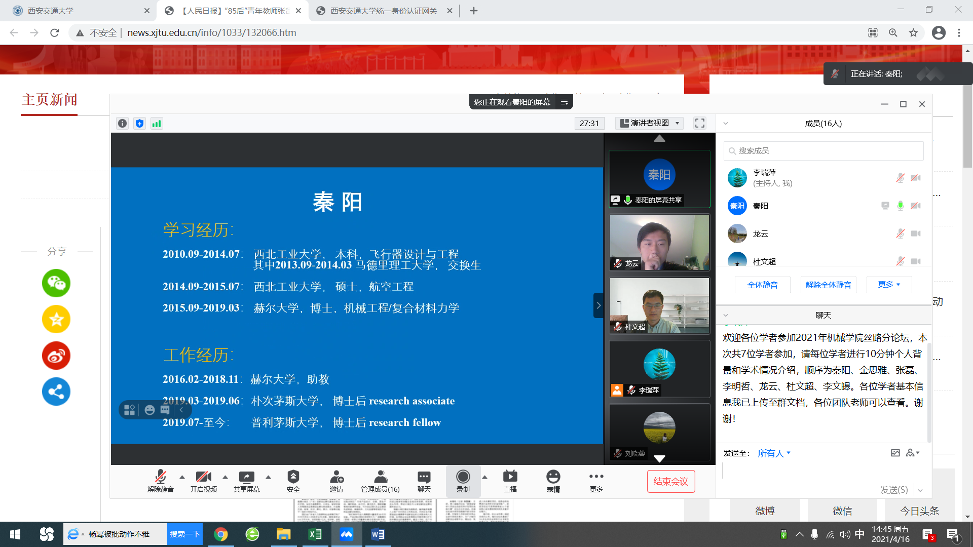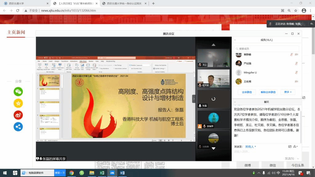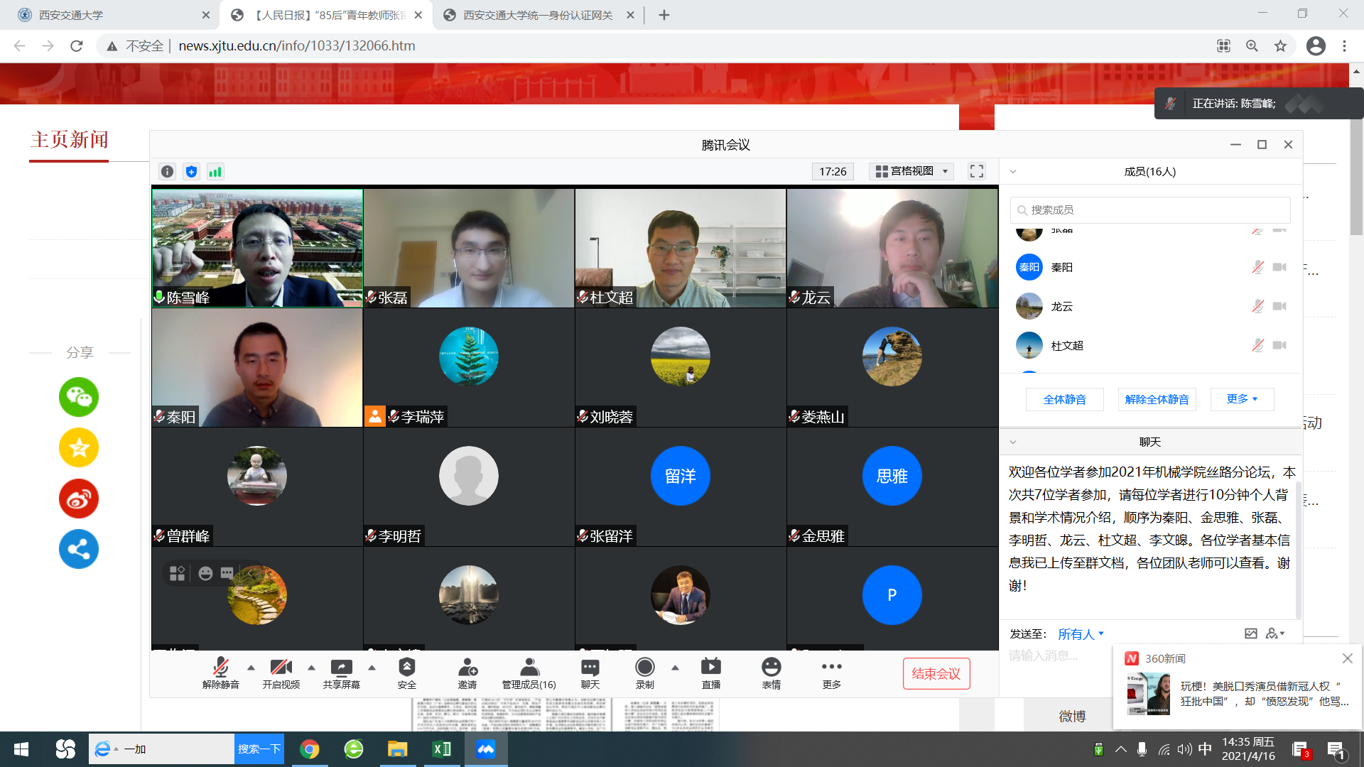 4月16日下午,第七届“丝绸之路青年学者研讨会”机械分论坛以线上方式召开。来自海内外不同国家的青年学者、学院青年人才及各相关领域的团队负责人通过网络会议“见面”、交流。世俱杯官方网站院长陈雪峰教授主持会议。