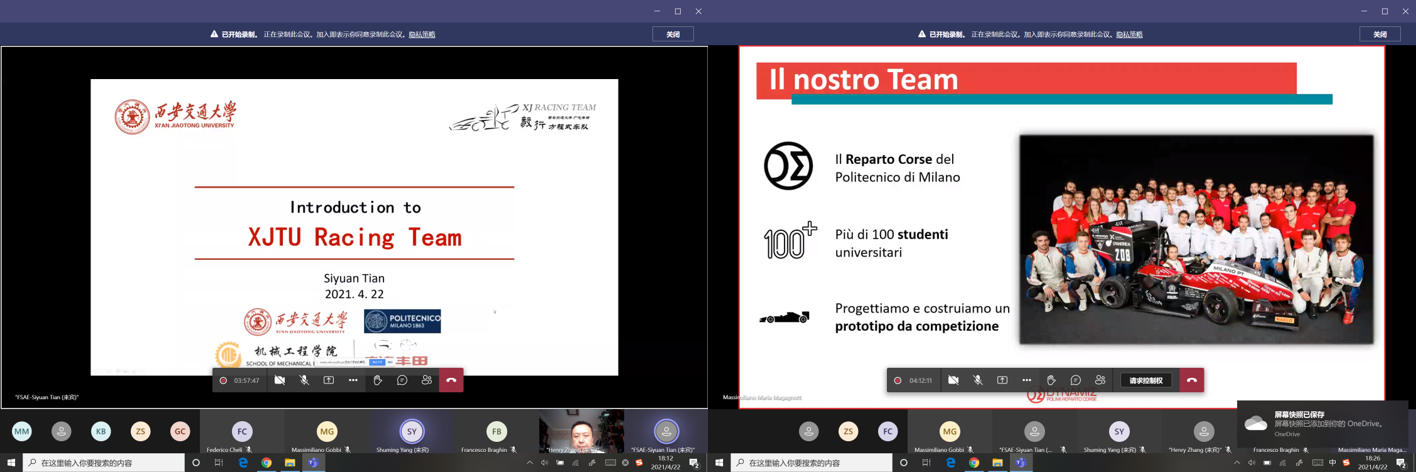 交流会结束后,双方还就车辆工程专业本科阶段学生交换、海外毕设等合作项目交换了意见,达成了初步合作意向;同时,米兰理工大学F1赛车队与西交大F1赛车队还进行了交流,双方队长分别介绍了车队的发展和现状,明确了交流合作意向。