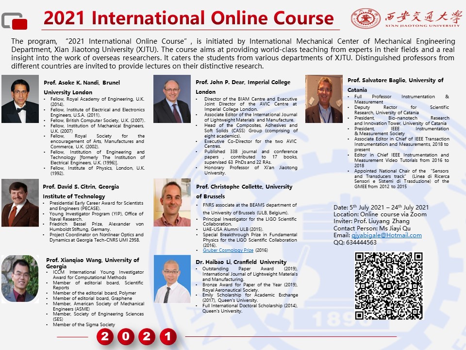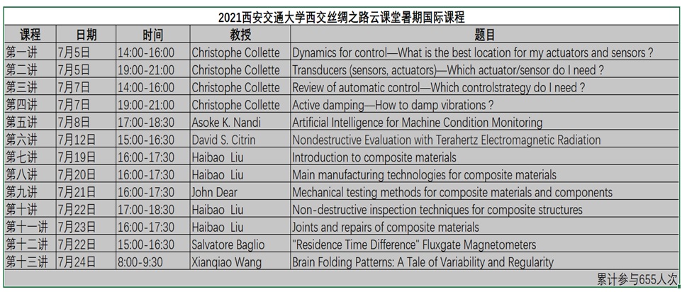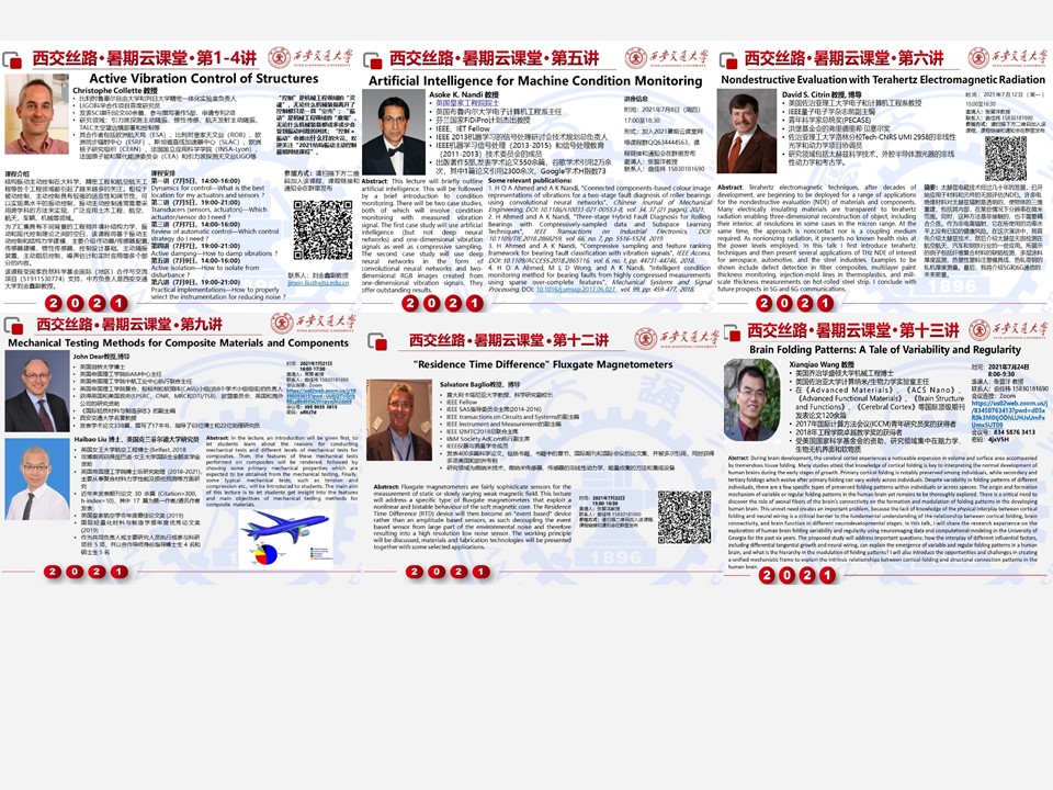 由世俱杯官方网站国际机械中心举办的2021世俱杯官方网站西交丝路云课堂暑期国际课程于2021年7月24日圆满落幕,该课程共13讲,内容涵盖了振动主动控制、人工智能故障诊断、太赫兹检测、结构与功能性复合材料、高性能传感器设计与应用、大脑皮层褶皱结构与大脑功能耦合规律等,邀请了包括英国皇家工程院院士Asoke K. Nandi教授在内的英国、比利时、意大利、美国等7位专家学者,线上累计参与课程人数达655人次。