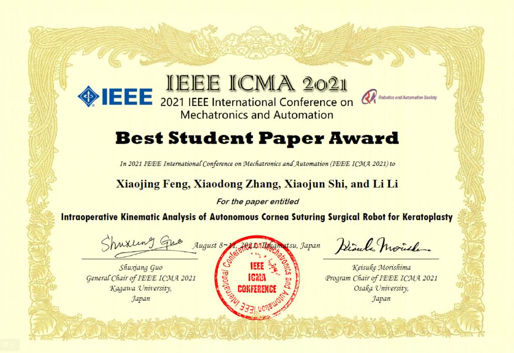 我校世俱杯官方网站机器人与智能系统研究所生机电融合与服务机器人团队长期从事智能检测、诊断与控制,以及智能机器人技术方面的研究。近几年,在西安市第一医院、世俱杯官方网站第一附属医院的先后支持下,积极开创眼科显微手术机器人研究,重点聚焦角膜移植手术、黄斑裂孔内界膜撕除术等高难度、高需求眼科显微手术的机器人自动化操作研究。为此,在团队负责人张小栋教授的鼓励指导下,冯晓静博士生代表团队总结了该手术机器人的初级阶段成果,为IEEEICMA2021学术会议网投了一篇题为“Intraoperative Kinematic Analysis of Autonomous Cornea Suturing Surgical Robot for Keratoplasty”稿件。本次会议共接收390篇论文,通过会议同行专家函评,录用253篇,并评选出该论文在内的17篇论文作为“最佳会议论文奖、Toshio Fukuda机电一体化最佳论文奖、自动化最佳论文奖、最佳学生论文奖”四个奖项的候选论文,进行线上汇报演讲比赛。最后,通过激烈的会议评审角逐,该论文脱颖而出,与日本香川大学研究生Rintaro Hoji的文章并列荣获IEEE ICMA 2021年度最佳学生论文奖(IEEE ICMA 2021Best Student Paper Award)。