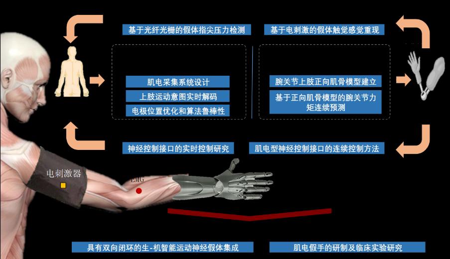 课题绩效评价专家组,在认真审查相关课题资料、听取课题负责人汇报的基础上,还对课题绩效评价成果进行了近20分钟的详细质询,最后经过专家组个人独立打分与闭门集体讨论,形成了课题三绩效评价结果为“通过”。同时,专家组认定课题三的创造性成果主要包括:①基于上肢肌电信号的拾取,采用集成学习算法,实现了对假手由4种手势、5种腕关节角度和3种负载组成的60种上肢复合动作意图的正向解码;②基于LSTM网络,同步采集连续动作下的肌电信号与腕关节角度信息,通过正向肌骨模型,建立了肌电与关节力矩之间的联系,实现了腕关节力矩的连续预测;③研究了光纤光栅的触觉检测技术,完成了假体指尖压力传感器的开发与制备,并能用于假手的触觉反馈;④提出基于电刺激的反向感觉通路重建策略,完成了电刺激器的下位机软硬件开发,实现了假手触觉的电刺激在体反馈与感觉重现;⑤提出一种肌电型神经控制接口的连续控制方法和假手自适应抓取控制策略,实现了24种操作模式的实时控制。八名专家对课题三的打分均在90分以上,此为课题赢得结题优秀提供了保证。