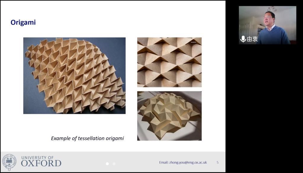随后是学术报告环节。受陈雪峰院长和陈贵敏教授的邀请,来自航天五院西安分院空间天线技术研究所的马小飞副所长、天津大学陈焱教授、牛津大学由衷教授,先后分享了关于《空间可展开结构及其商业化应用现状》、《厚板折纸》以及《Kinematic Morphing Structures and Metamaterials》的三场精彩的学术报告,其中后两场报告是在线举行。值得一提的是,虽然由衷教授身处英国,与国内有9个小时的时差,他也在当地时间早上6点就加入到线上交流中。