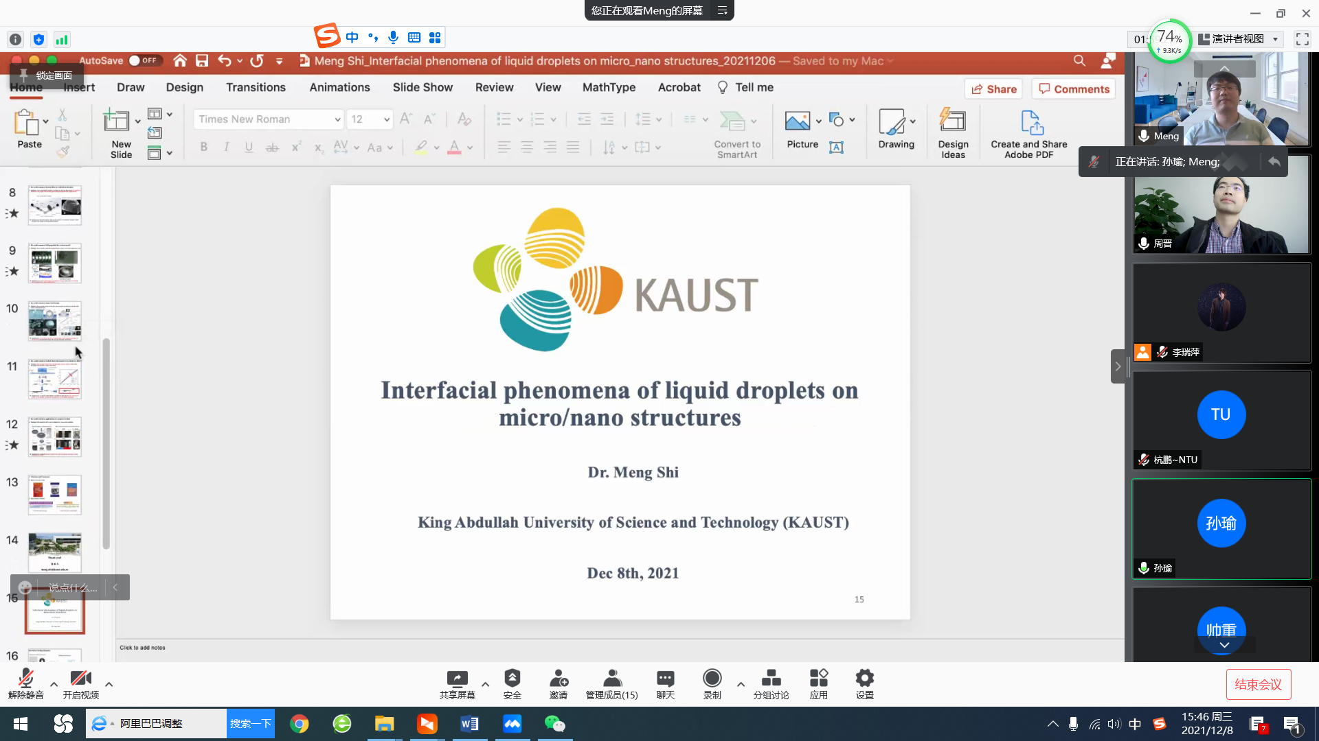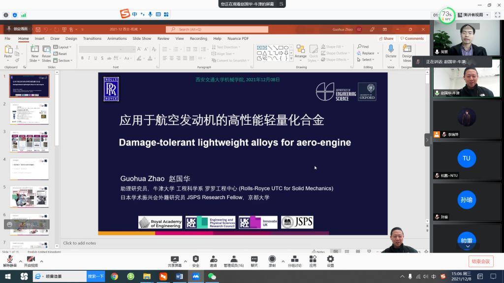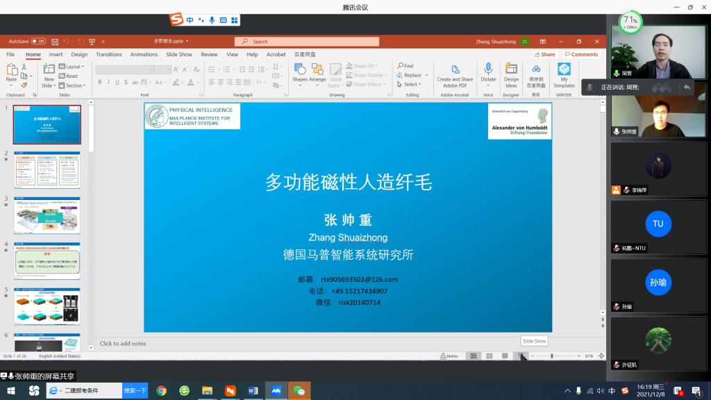 此次参加丝绸之路机械分论坛交流的青年学者来自美国、英国、德国、日本、新加坡等国家的著名高校及研究院,各位学者就个人背景及学术研究情况进行了介绍,关于复合材料、泡沫金属加工、界面流体、微小型机器人等最新前沿科技研究成果隔空传递,参会教师对于学者们的研究内容也提出了很多感兴趣的问题。各位学者对于学科、工作环境、科研现状、实验设备以及创新港的建设速度和成果赞不绝口,会上咨询了很多关于人才计划的问题,纷纷表示希望学院能够推荐合适的岗位,早日加盟学院。