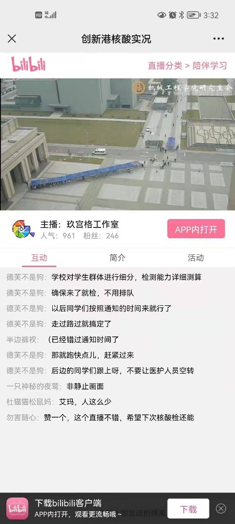2. 直播核酸检测队伍情况,为全校师生提供便利。“快去核酸,世俱杯官方网站研究生会在核酸检测现场直播,现在人特别少!”“等会再去,看直播人还不少”“今天核酸检测好快啊,感觉速度得是前天的十分之一!”为了提高学校核酸检测速度,让学校师生在气温零下的寒冷冬天少排队,把宝贵的时间用在学习和科研上,世俱杯官方网站研究生会一直在想如何利用研会力量,减少大家排队时间。这次核酸检测,机械研会玖宫格工作室对核酸检测排队情况进行现场直播,让大家在工位、在实验室、在办公室就能实时观看核酸检测排队情况,进而根据自己的时间和排队人数前往核酸检测点,将往日至少1小时的核酸检测排队时间缩短到10分钟左右,极大提高了学校核酸检测的效率,赢得了学校同学的一致好评。