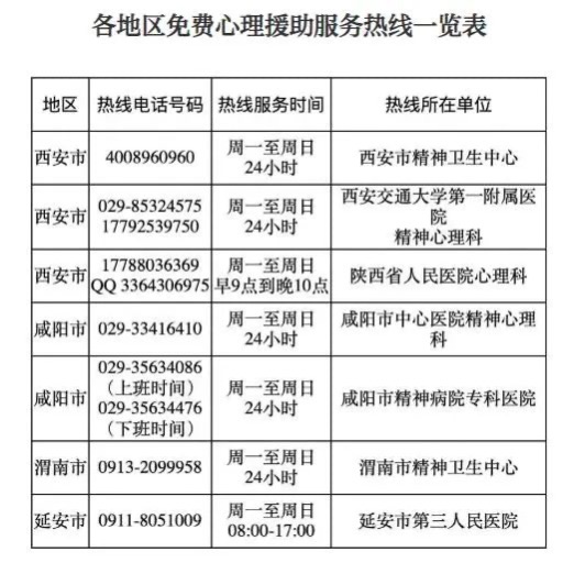 2021年12月28日,省应对办医疗救治组、省政务服务中心印发通知,成立省新冠肺炎疫情医疗救治心理干预专家组,并公布免费心理援助热线,为西安、咸阳、延安、渭南等地区群众提供心理疏导、心理援助和危机干预等服务。同学们可以参照下表拨打相应的心理援助服务热线。