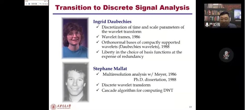 严如强教授分享了《小波变换理论及其在制造业中的应用》一书,他从心电图信号、鸟儿歌声的信号和机械振动的信号来引出信号的定义,即承载某种信息并作为通信手段的物理量,而信息是物理系统的状态或特征信息。系统阐述了关于信号以及信号处理的目标问题。严如强教授强调,本书的借鉴意义很强,要学习工程领域信号的分析、加工、识别、传输和存储等问题的处理方法,来探索小波分析在信号处理中的重要应用。