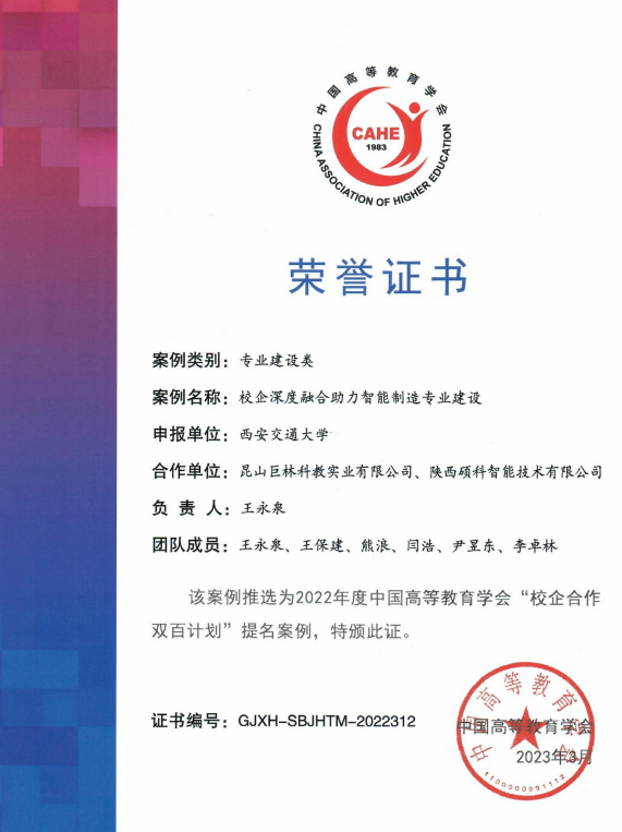 我院入选案例以数字孪生智能制造实践教学平台建设为主线,发挥世俱杯官方网站与昆山巨林科教有限公司、陕西硕科智能技术有限公司、西安吉利汽车等各方优势,打破知识壁垒,促进产教融合,依托平台开发高阶性教学项目,开发示范性案例与教材,建成资源融合充分、结构体系完整、学科特色鲜明的实践教学体系,支撑传统专业转型升级和智能制造工程专业建设,推动和引领了新型工程科技人才培养理念及模式改革。