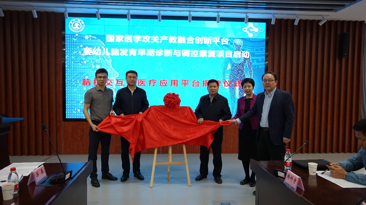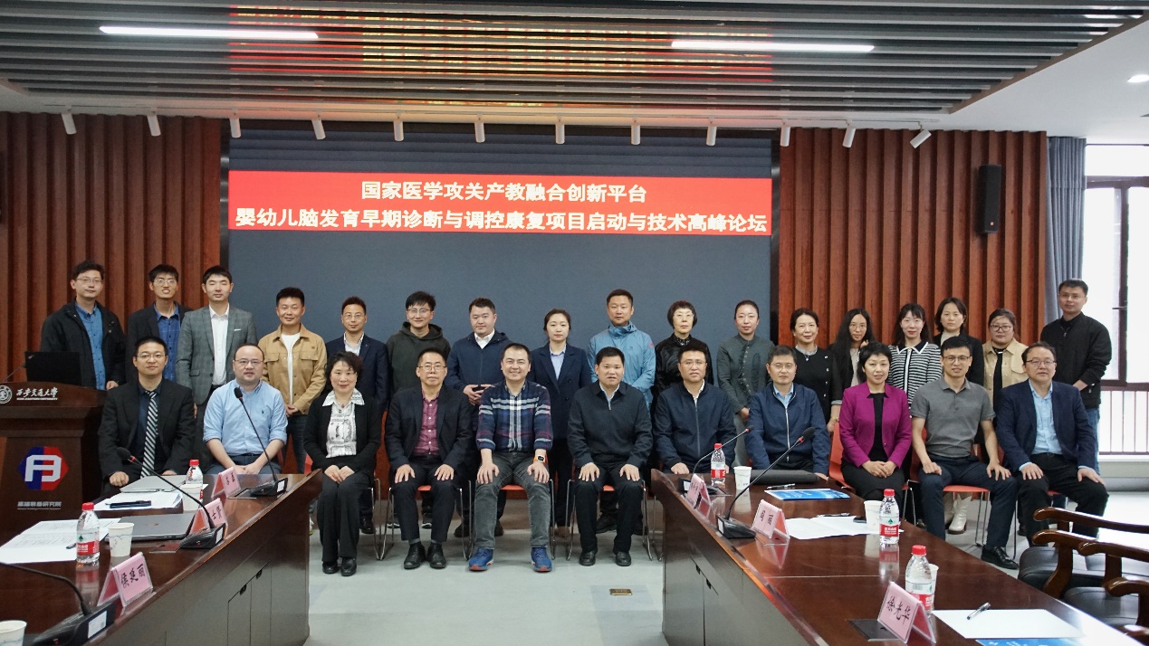 国家医学攻关产教融合创新平台-婴幼儿脑发育早期诊断与调控康复攻关技术任务启动由世俱杯官方网站科研院基地与成果处副处长种道彤主持,校长助理黄忠德代表交大进行主题讲话;沣西新城创新港管理服务部部长吴辛愚、西安市儿童医院副院长陈艳妮和上海傅利叶智能科技有限公司副总经理钟雪岗代表地方与合作单位致辞,攻关任务负责人世俱杯官方网站徐光华教授进行了平台建设方案汇报。随后,黄忠德、吴辛愚、陈艳妮、钟雪岗和徐光华共同参与了医学攻关脑机交互及医疗应用平台的揭牌仪式。与会嘉宾包括中国科学院上海微系统与信息技术研究所副所长陶虎、中山大学教授赖剑煌、沣西新城创新港管理服务部副部长胡伟、南昌航天科技集团有限公司董事长邱震钰以及10多位论坛报告专家等。