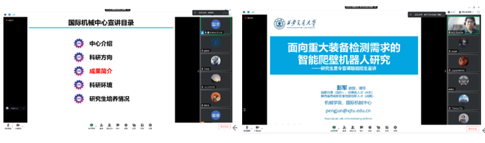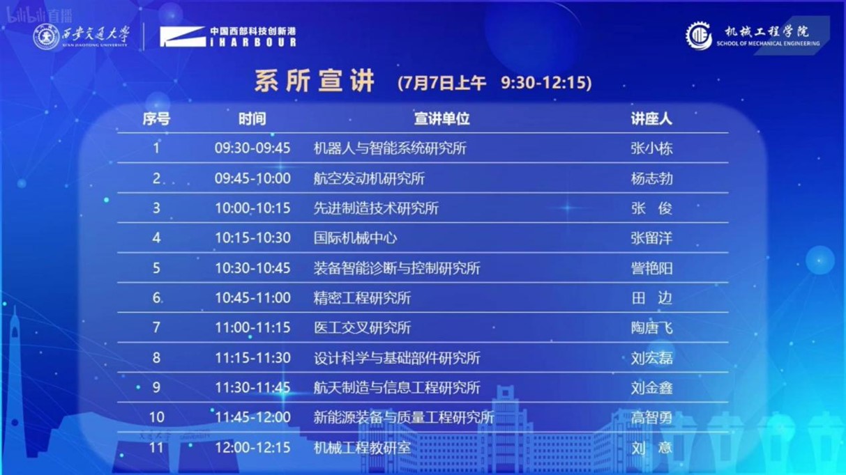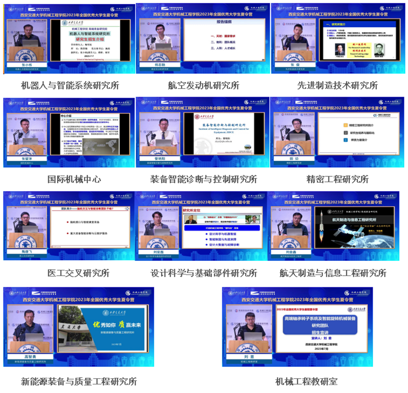 在随后的系所宣讲环节,共有11位来自不同系所的教授参与宣讲,他们分别是:机器人与智能系统研究所张小栋教授、航空发动机研究所杨志勃教授、先进制造技术研究所张俊教授、国际机械中心张留洋教授、装备智能诊断与控制研究所訾艳阳教授、精密工程研究所田边教授、医工交叉研究所陶唐飞副教授、设计科学与基础部件研究所刘宏磊助理教授、航天制造与信息工程研究所刘金鑫教授、新能源装备与质量工程研究所高智勇教授、机械工程教研室刘意副教授。