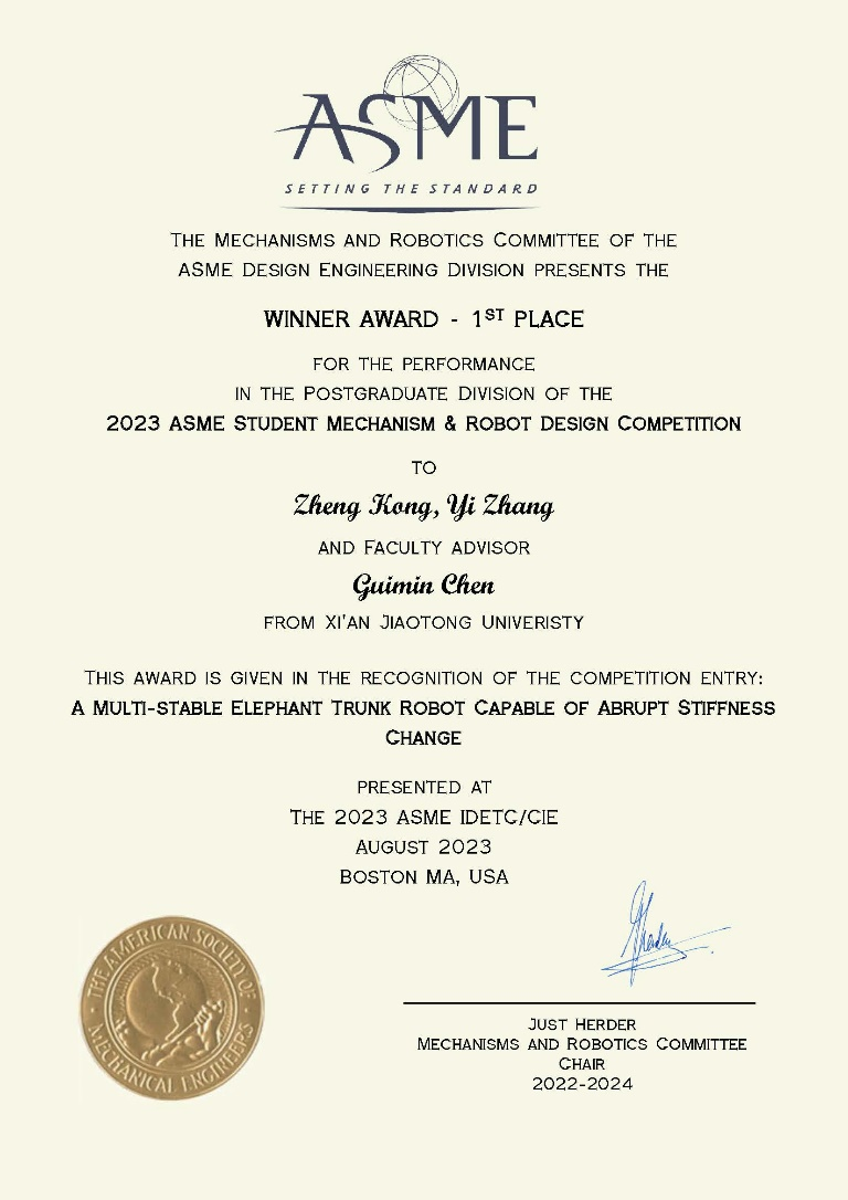 ASME学生机构与机器人设计大赛由美国自然科学基金委员会(NSF)美国机械工程师学会和共同主办。该竞赛始于2006年,每年举办一次,分为“本科生”和“研究生”两个组别,参赛学生来自全世界多个国家和地区,是机构与机器人设计领域最有影响力的国际学生竞赛。