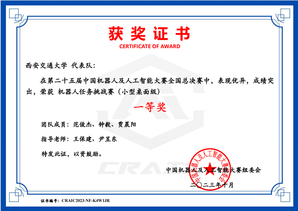 近日,第二十五届中国机器人及人工智能大赛小型桌面应用场景赛全国总决赛公布比赛成绩,我校首次派出两支队伍参加了比赛,获得一等奖1项、三等奖1项。