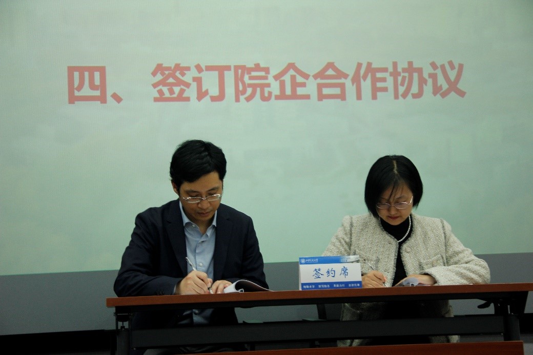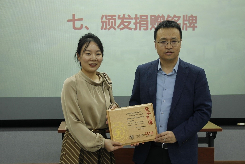 邢晓强和唐宇倩分别代表学校教育基金会、索辰科技签订捐赠协议,并颁发捐赠铭牌。