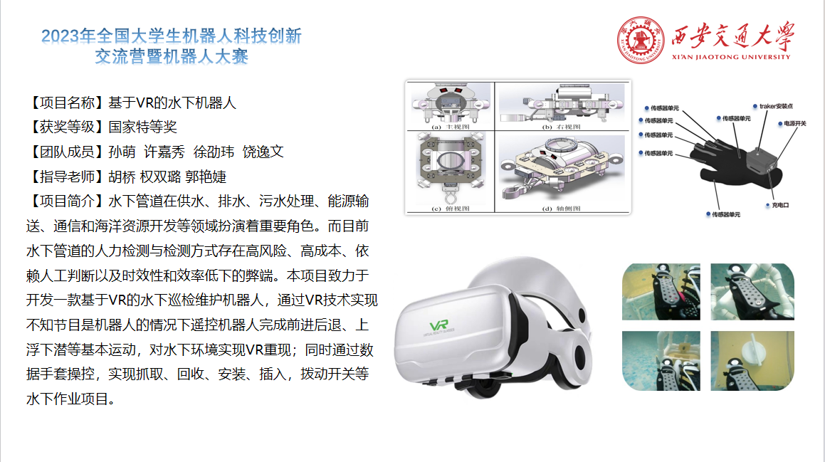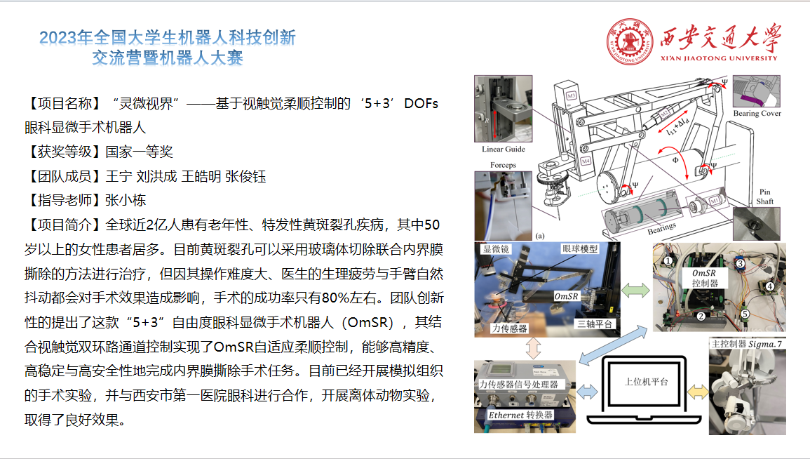 由西安交大世俱杯官方网站胡桥、权双璐、郭艳婕老师指导的“基于VR的水下机器人”项目荣获特等奖;张小栋老师指导的“灵微视界——基于视触觉柔顺控制的‘5+3’DOFs眼科显微手术机器人”项目荣获一等奖;梅雪松、徐俊老师指导的“电力能源巡检运维带电操作机器人(ARIS-HSR)”项目荣获三等奖。
