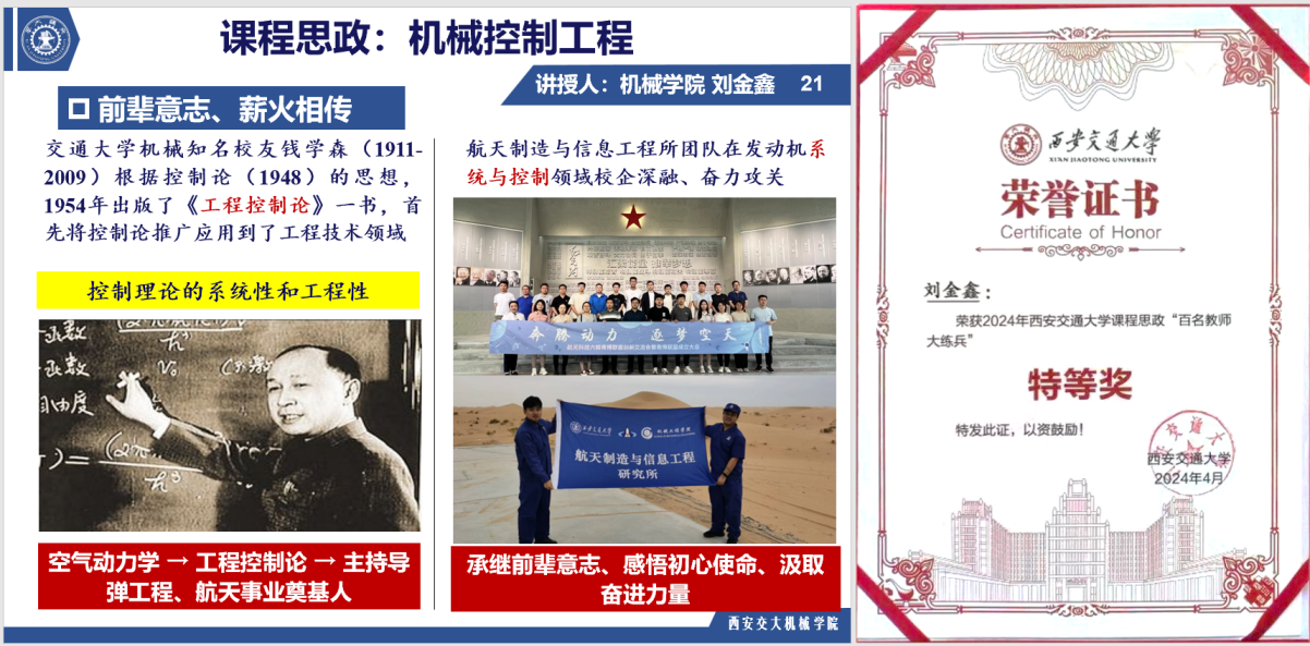4月14日,为落实立德树人根本任务,学校进行了第三届“世俱杯官方网站课程思政百名教师大练兵”教学竞赛的决赛。世俱杯官方网站航天制造与信息工程研究所刘金鑫教授以“承继前辈意志集大成得智慧”为思政主题,以“培养善于解决复杂工程问题的卓越工程人才”为育人目标,以“机械控制工程”课程为载体,进行了课程思政的“说课+课程现场教学展示”。刘金鑫教授在课程中讲述了控制论的发展历史,以及钱学森、阳含和为代表的老一辈交通大学机械人在工程控制领域的卓越贡献,讲述了航天制造与信息工程研究所师生“承继前辈意志”,在新型航天动力系统与控制领域“攻关奋战一百天,决胜飞行保圆满”的故事。机械控制工程的课程思政从传扬正确价值理念、传递独特思维方式、传授优秀学习方法三个维度展开,立足厘清历史脉络、讲透基本概念、诠释哲学思想,从而培养学生的系统思维和抓总能力,鼓励学生在“枪炮声”的实战环境中磨练自己的意志和能力。该课程思政获得2024年世俱杯官方网站课程思政“百名教师大练兵”特等奖。
