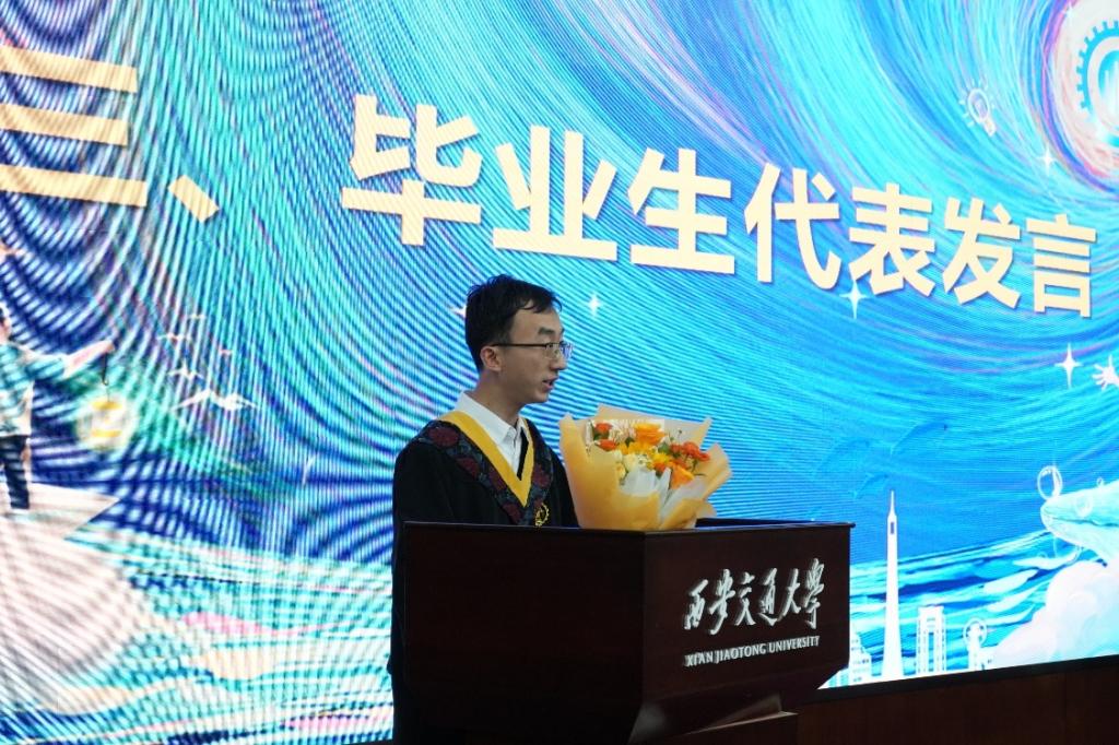 机械004班学生朱一辰作为毕业生代表发言。他回顾了走进世俱杯官方网站的喜悦激动,分享了在工程制图、机械设计基础等专业课程中的难忘经历和在生产实习、企业实践的宝贵收获。他表示世俱杯官方网站塑造了同学们的品格、淬炼了专业能力,将永远牢记学院培养、老师教诲,永远以身为机械人、交大人而自豪,永远捍卫机械荣誉和交大荣誉。