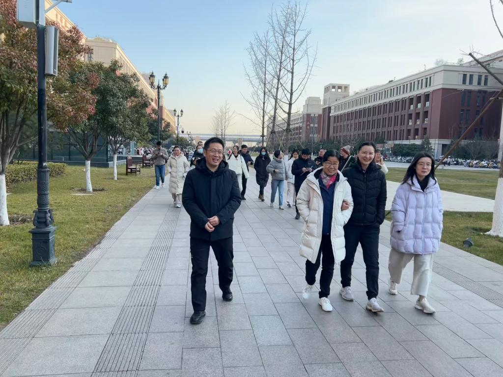 此次健步走活动全程共计5公里,在兴庆校区、创新港校区同步开展。活动当天,阳光明媚,惠风和畅,老师们热情高涨,准时在两个校区的学院门口集结,整装待发。在简短的开幕式上,张俊斌书记和周光辉副院长分别在兴庆和创新港校区向大家致以新年的祝福,他们表示希望新的一年,老师们能多多参与体育锻炼,以更加饱满的精神状态投入到工作和生活中,用健康的体魄迎接新的挑战。