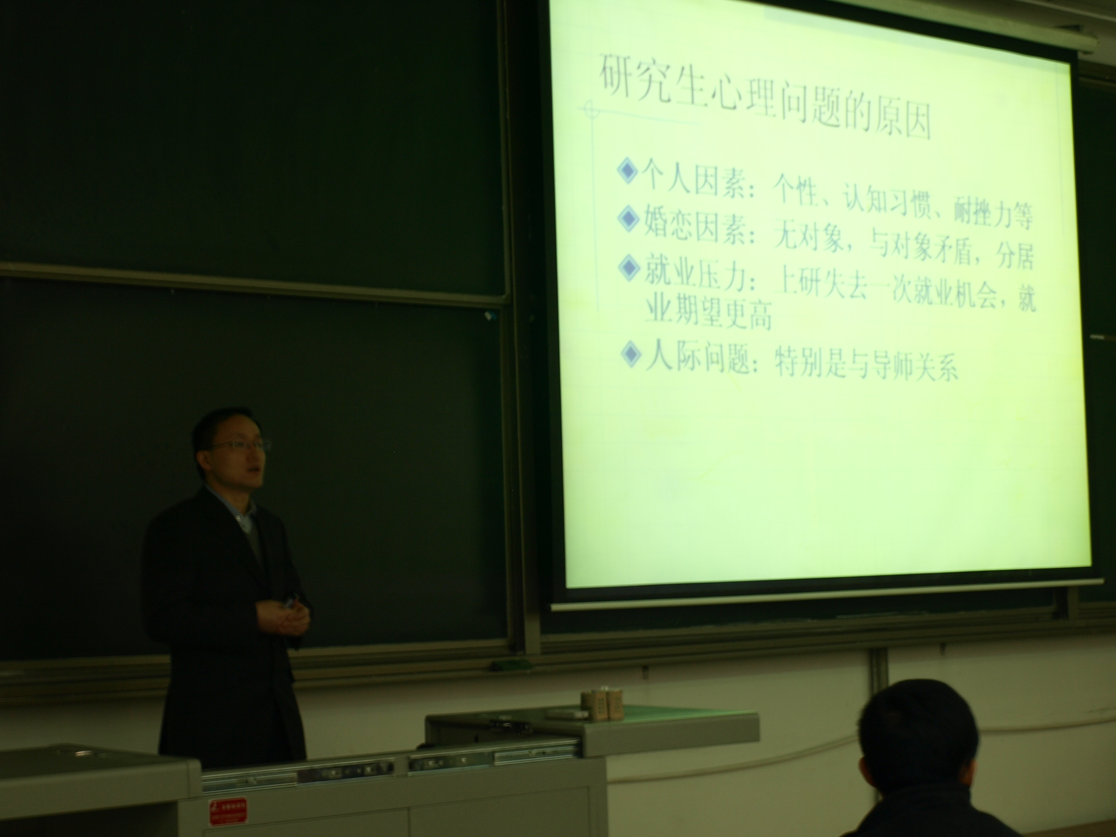 2013年12月25日-27日,世俱杯官方网站特邀请世俱杯官方网站大学生心理健康教育与咨询中心心理咨询师姚斌博士为全体博士生、硕士生开展了两期关于“研究生心理健康与自我调节”的主题讲座,院党委副书记杨鹏、辅导员雷励、何月、学院王昌老师出席了讲座。此次系列讲座深入浅出,从学生身边的生活实例出发,为广大研究生提供了专业的帮助和建议,现场反响热烈,得到广大学生的一致好评。