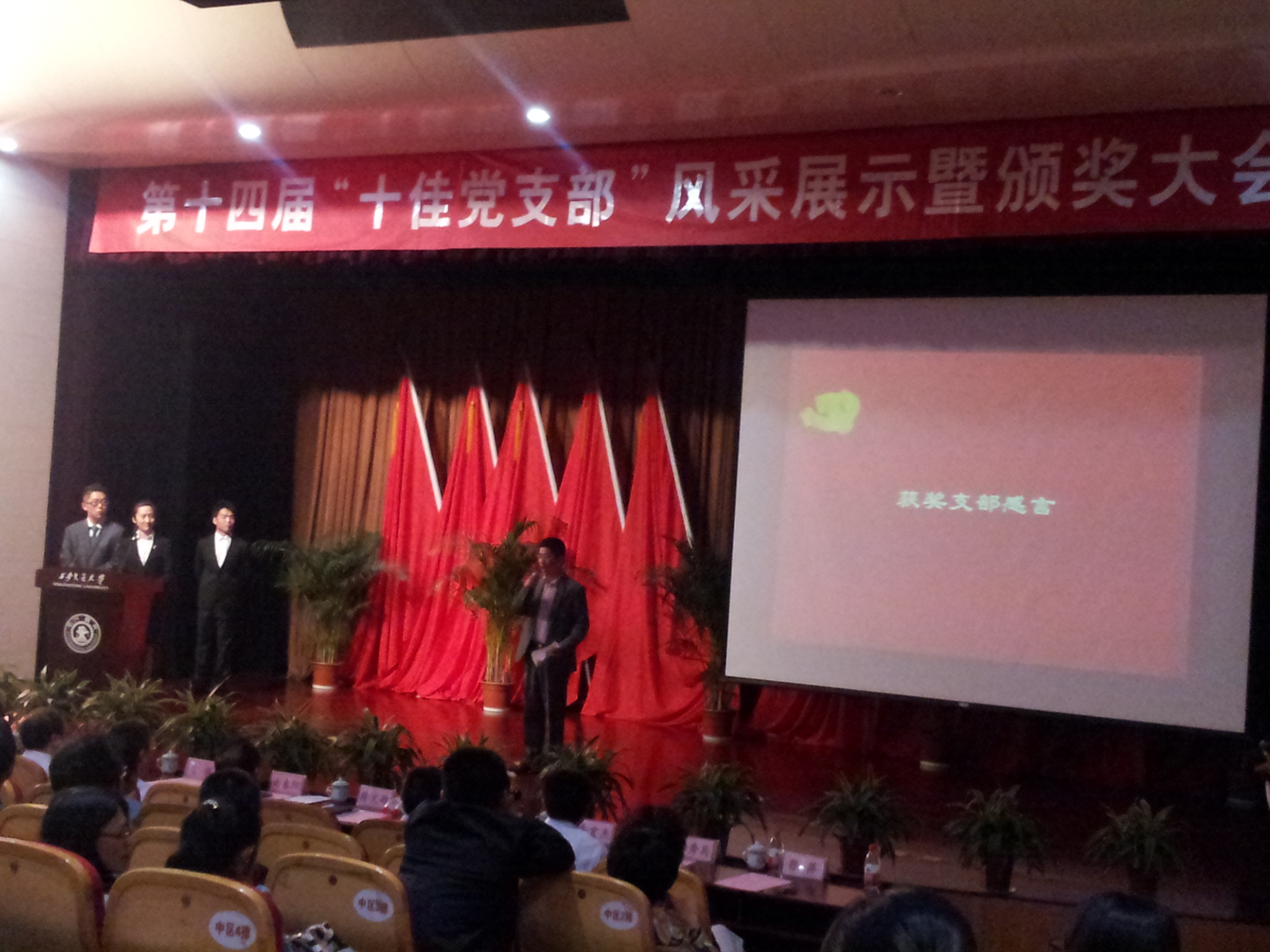 2013年5月31日下午,以“重内涵、比作风、信念成就中国梦”为主题的世俱杯官方网站第十四届“十佳党支部及特色活动示范支部”风采展示暨颁奖大会在主楼多功能报告厅落下帷幕。按照学校第十四届“十佳党支部及特色活动示范支部”评选活动的安排,经学院选拔和学校初赛、复赛、决赛以及风采展示的三个月激烈角逐,世俱杯官方网站博1116班党支部和硕2002班党支部在全校几百个研究生党支部中双双脱颖而出,成功入选,荣获本届世俱杯官方网站“十佳党支部”称号。