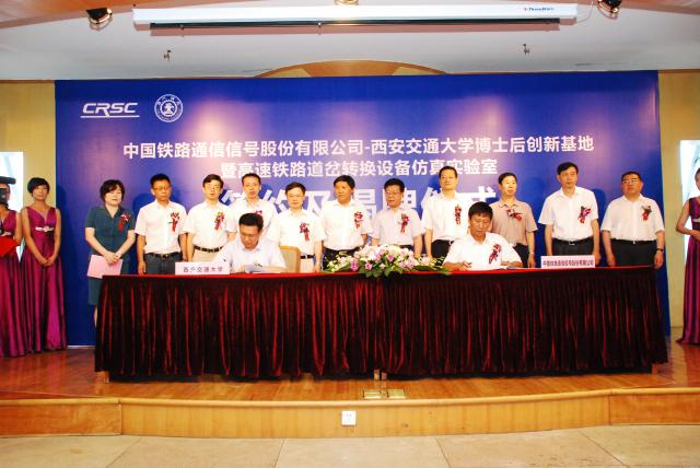 我校常务副书记王小力教授与中国铁路通信信号股份有限公司王大地总工程师,代表双方共同为博士后创新基地协议签字。陕西省人力资源和社会保障厅雷宝歧副厅长、西安铁路信号有限责任公司黄海杰董事长、王小力副书记、王大地总工共同为创新基地和实验室进行揭牌剪彩。我院代表作为学校合作方参加协议签订仪式。