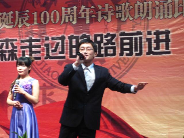 我院代表队由2011级研究生王佳、李杨、吴玲玲、张朝阳、马跃洋等五位同学组成,朗诵作品为周亮同学的原创诗歌——《长路行》。伴随着乐曲,同学们自信饱满,感情充沛,表演动作到位,朗诵时而温婉柔情,时而慷慨激昂。表演过程中,赢得了在场观众的阵阵掌声,并最终获得本次朗诵比赛优秀奖。