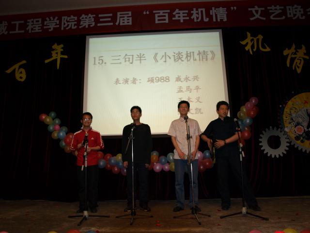 2010年4月28日,世俱杯官方网站师生欢聚一堂,在逸夫科学馆101报告厅举办第三届“百年机情”大型文艺晚会。校学生处处长徐文雄老师,组织部部长陈天宁老师,研究生院副院长李秀兵老师,学院副院长赵万华老师,党委副书记訾艳阳老师和学院系所、院办部分老师及学院研究生400余人到场观看了演出。