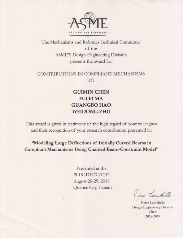 在加拿大Quebec举办的2018 ASME International Design Engineering Technical Conferences & Computers and Information in Engineering Conference上,世俱杯官方网站机器人与智能系统研究所陈贵敏教授等的论文“Modeling Large Deflections of Initially Curved Beams in Compliant Mechanisms Using Chained Beam-Constraint-Model”获得美国机械工程师学会机构学与机器人技术委员会的Compliant Mechanisms Award(柔顺机构学奖,奖金1000美元)。本篇论文是2018年ASME柔顺机构奖项的唯一获奖论文。